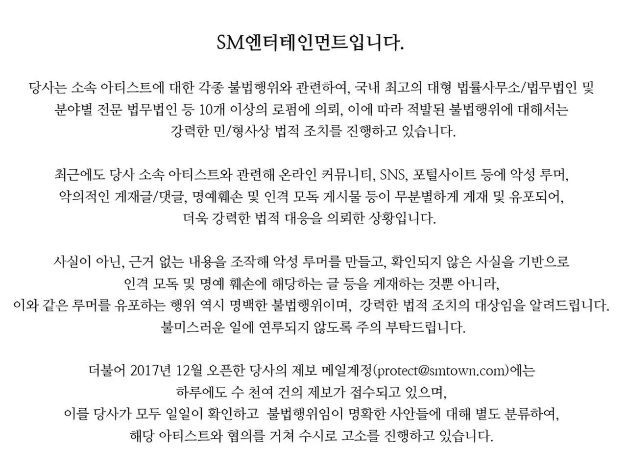 [D Official sm] SM娱乐公司与关联艺人的违法行为有关,被要求从各个领域请求10多个低农场,例如日本最大的律师事务所/法律公司和专业法律公司。宣布对非法活动采取强有力的民事/刑事法律措施。
