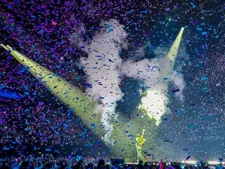 JIN眨着眼睛,比出“和平”的手势,展现出可爱的魅力。在五彩纸屑中,JIN站在聚光灯下的形象,传达着当时热烈的瞬间。