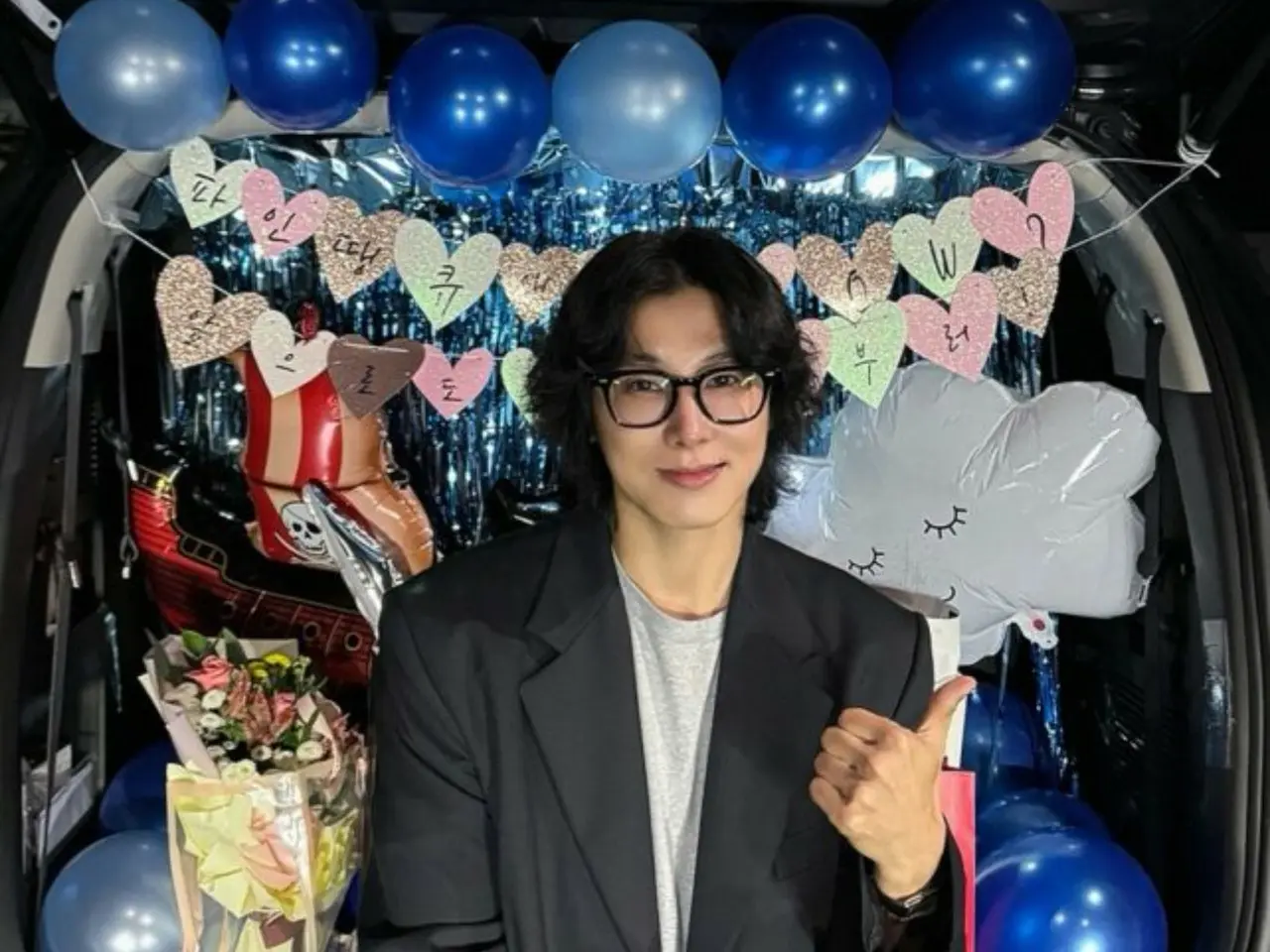 照片中允浩(U-KNOW)竖起了大拇指。允浩(U-KNOW)留着长发,戴着黑框眼镜,身穿宽松外套。他露出轻松的笑容,竖起了大拇指。