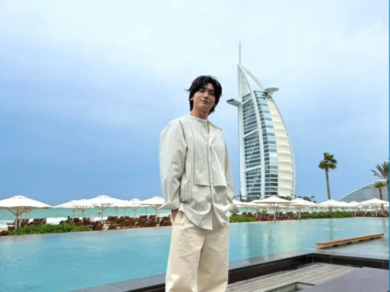 公开的照片中,亨植在度假村摆造型,身穿条纹衬衫和象牙色宽裤。