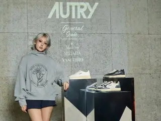 Somi 将 AUTRY 的灰色运动衫和海军蓝裤子与合作款白色运动鞋搭配在一起,打造出舒适而精致的造型。