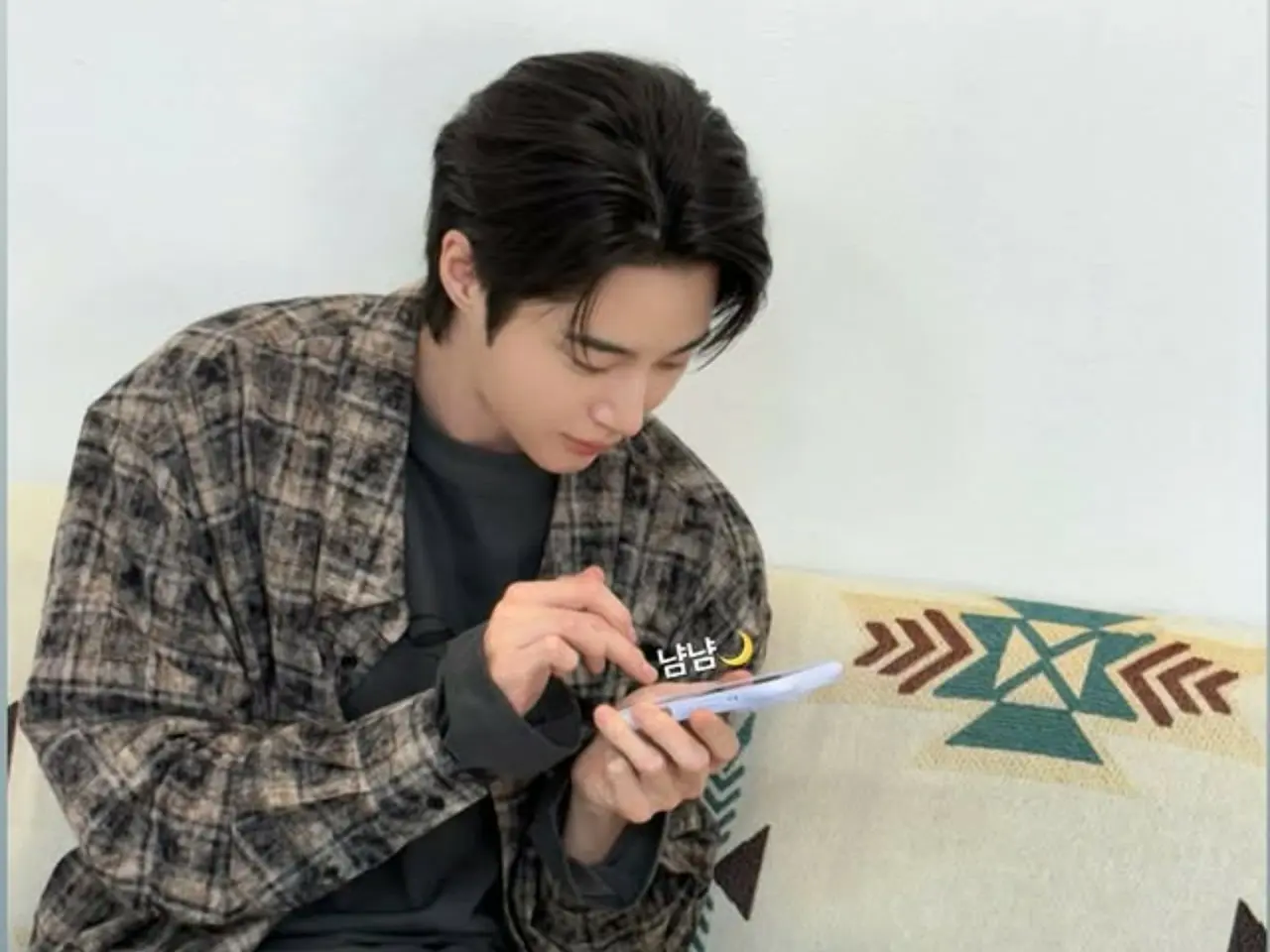 公开的照片中,卞宇硕盘腿而坐,看着智能手机。