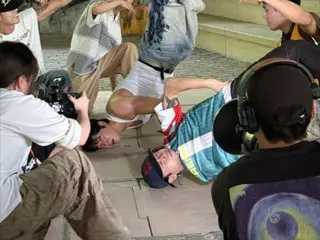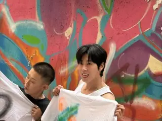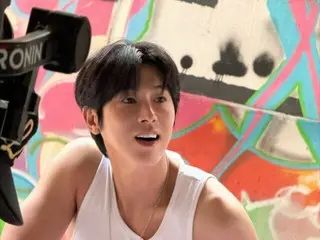 照片显示允浩(U-KNOW)正在拍摄写真,他脱掉了T恤的一只袖子。