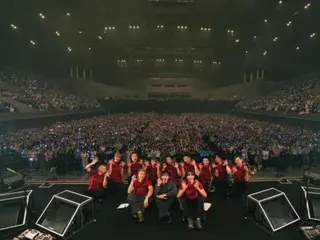 此外,成员们还被拍到身穿酒红色T恤,与现场粉丝合影留念。